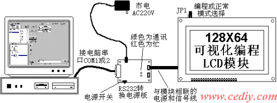 用户首先在电脑上完成LCD显示界面的编辑,资料下载及仿真调试工作,所配仿真调试软件可使用户方便的进行上述工作,在硬件上除可视化编程LCD模组之外还配有一块电脑RS232电平转换转接板,此板负责模块与电脑联接和对模块的供电,模块与电脑联接图示如下。
